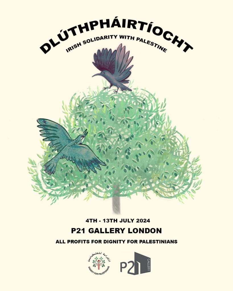 In July 2024, we exhibited Dlútpháirtíocht: Irish Solidarity with Palestine at P21 Gallery in London. The exhibition was curated by Daragh Drake and Seán Óg Ó Murchú and was the world’s largest contemporary international exhibition of Irish artists. We also featured international artists.